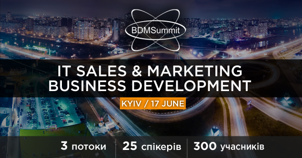 17 червня в Києві відбудеться конференція BDMSummit 2017 Summer для sales-менеджерів, business development менеджерів, власників IT-аутсорсингових компаній, а також для всіх, хто бажає бути в курсі IT-тенденцій! У заході братимуть участь близько 300 учасників та 25 спікерів, які досягли значного успіху в продажах і розвитку своїх IT компаній. Деталі та відгуки на офіційному сайті BDMSummit.
